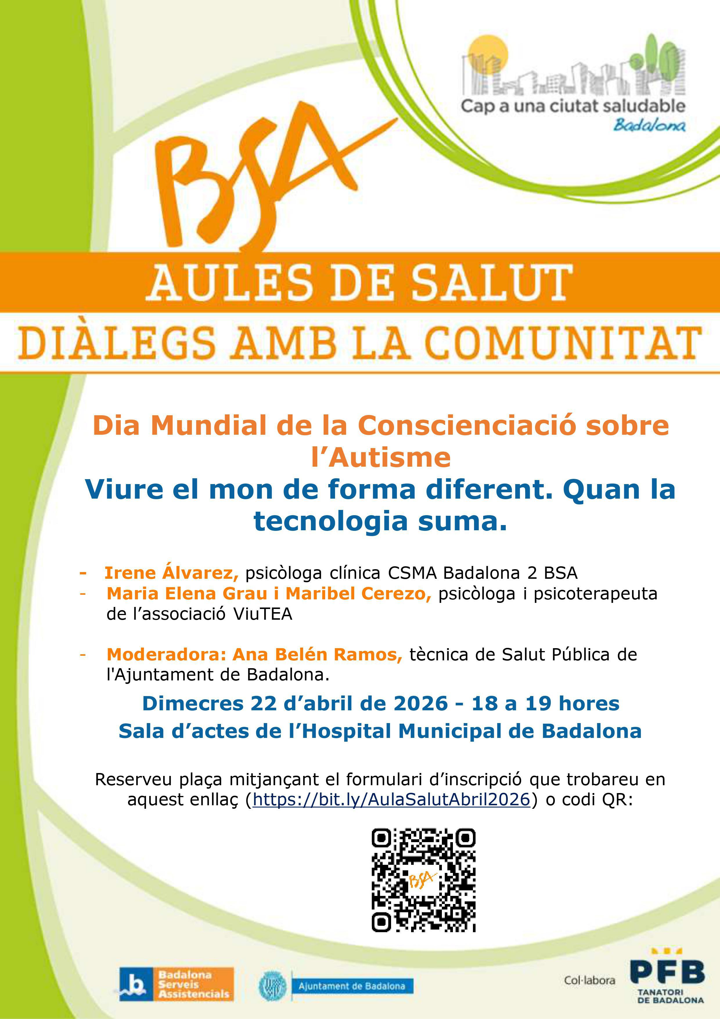 La sala d’actes de l’Hospital Municipal de Badalona acollirà dimecres 22 d’abril, de 18 a 19 hores, la xerrada “Viure el món de forma diferent. Quan la tecnologia suma”, emmarcada en els actes al voltant de la celebració aquest dijous, 2 d’abril, de Dia Mundial de la Conscienciació sobre l’Autisme.